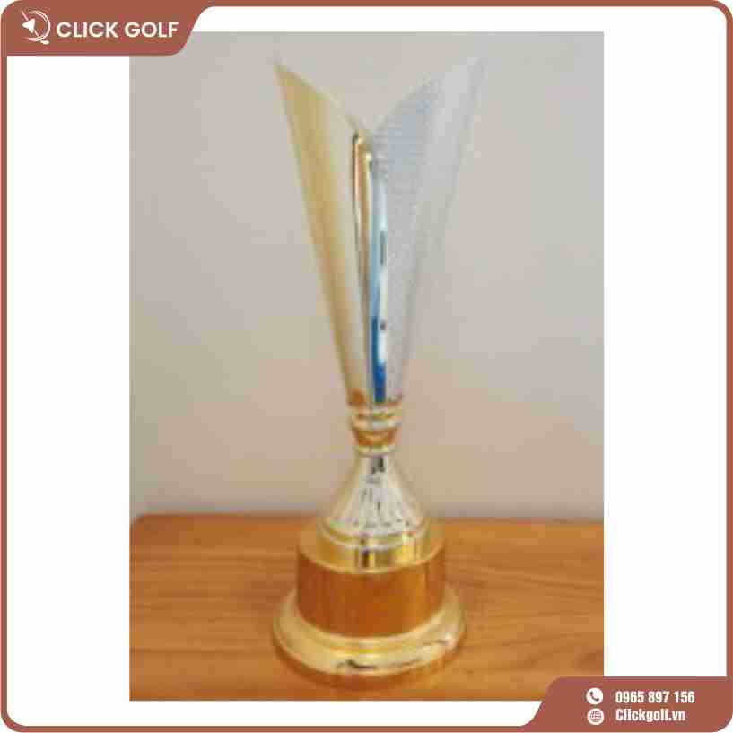 Cúp kim loại cao cấp, họa tiết laser, hai thành phần vàng – trắng; đế kim loại tròn