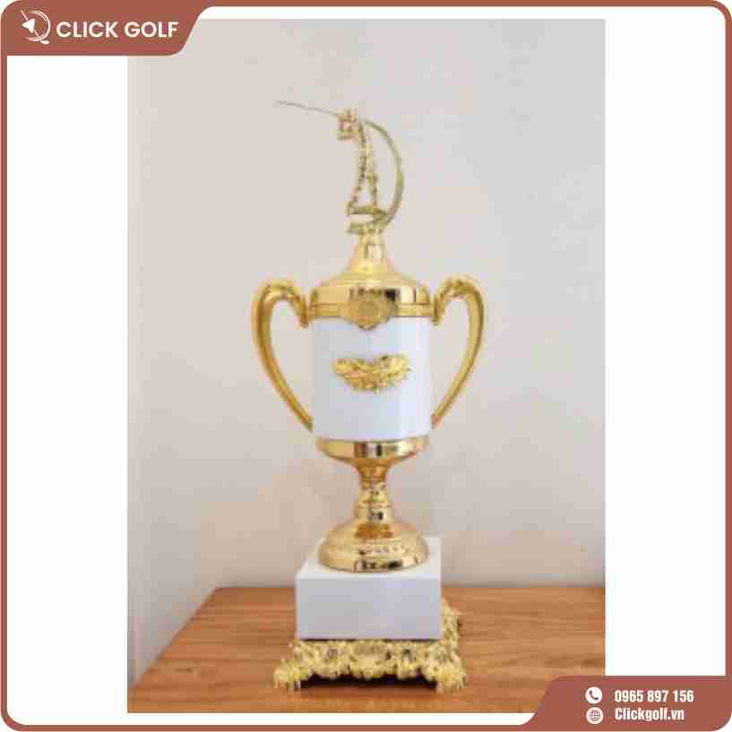 Cúp thể thao kim loại màu vàng- trắng, đường kính 160mm, hoa văn nghệ thuật, đỉnh Swing