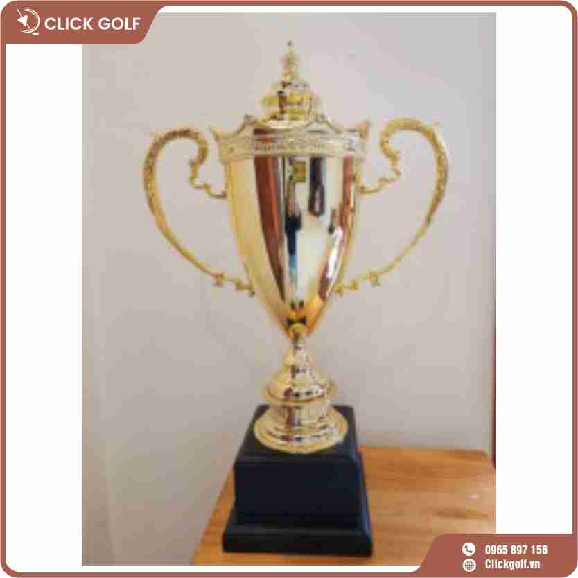 Cúp thể thao kim loại màu vàng cao cấp, đế gỗ, tai rộng